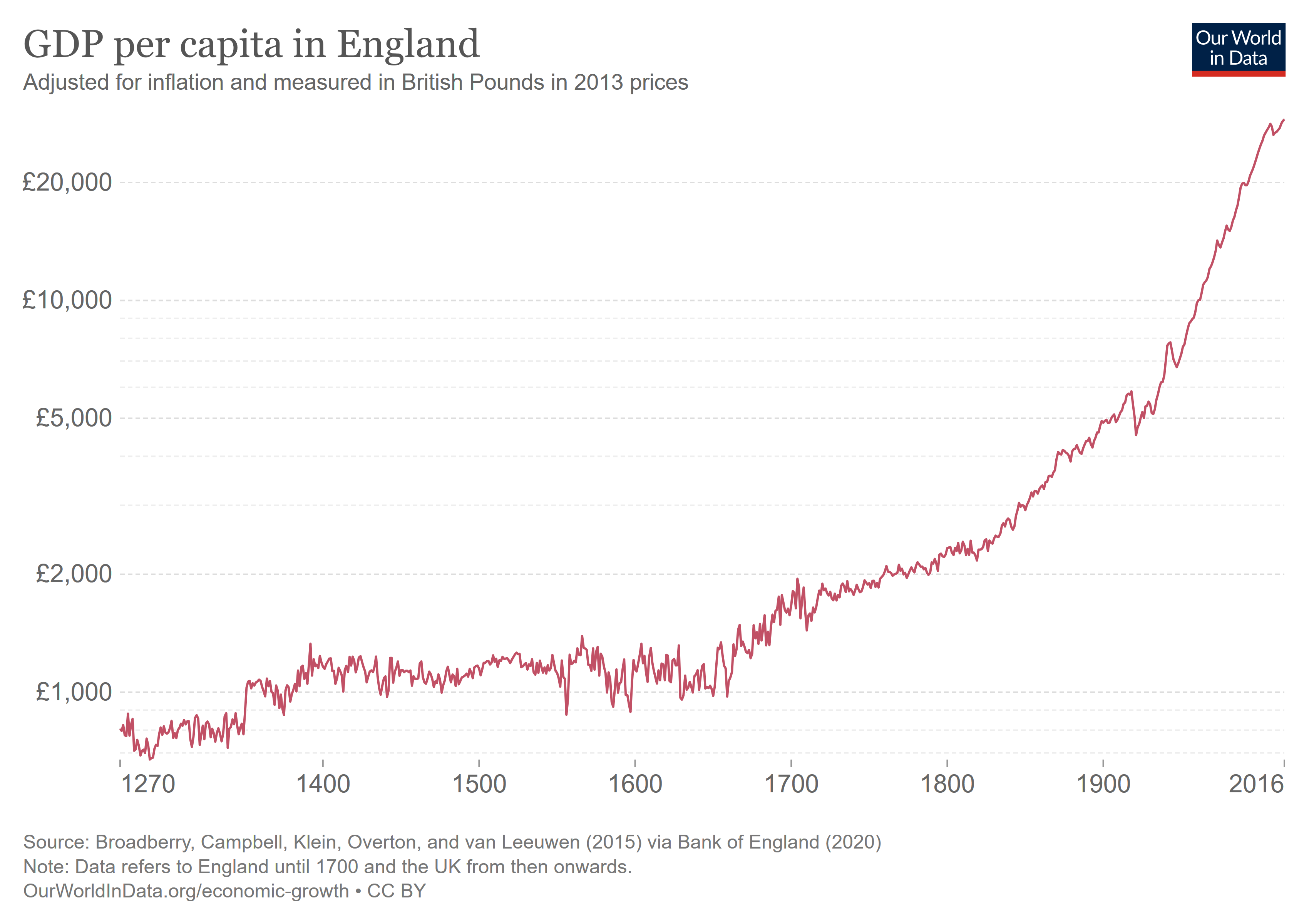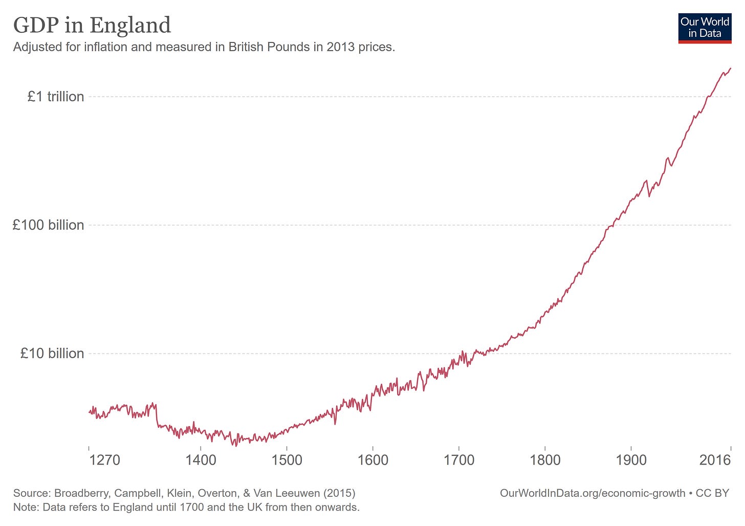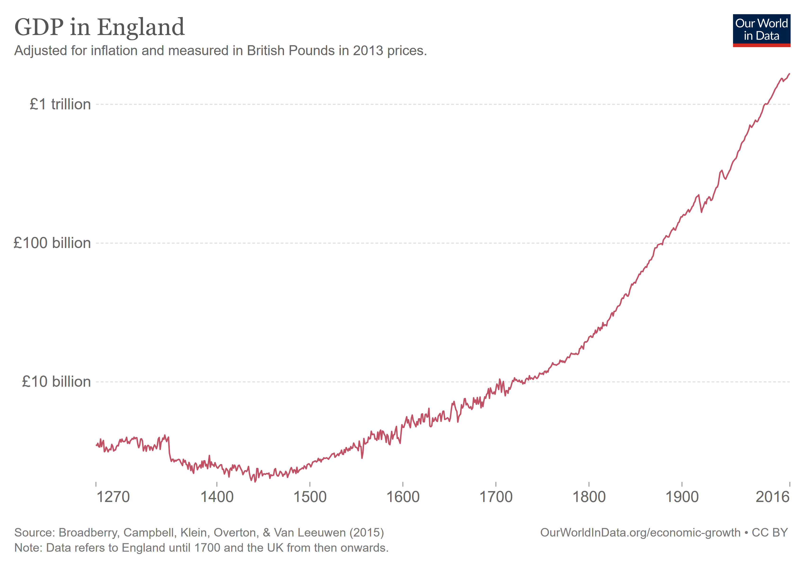 According to data compiled by Our World in Data, between 1345 and 1575 England's GDP was flat. This is a shocking surprise if you think that between these 240 years, the printing press was invented, America was discovered and a significant number of low-hanging fruits there were discovered.